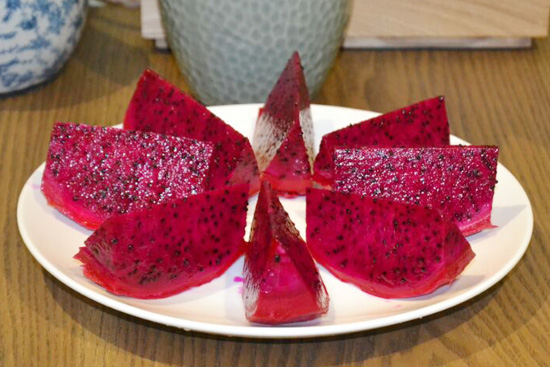 6、火龙果果实汁多味清甜、除鲜食外、还可酿酒、制罐头、果酱等。花可干制成菜、颜色可提炼食用色素。